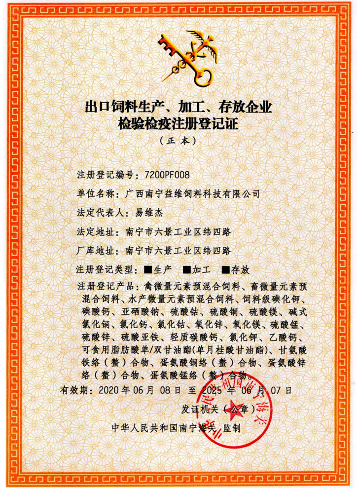 益維—出口飼料生產(chǎn)加工存放企業(yè)檢驗(yàn)檢疫注冊(cè)登記證